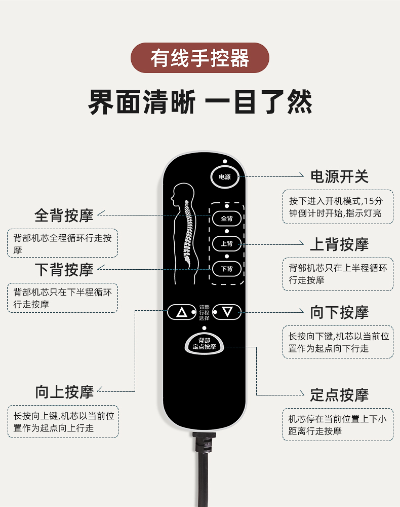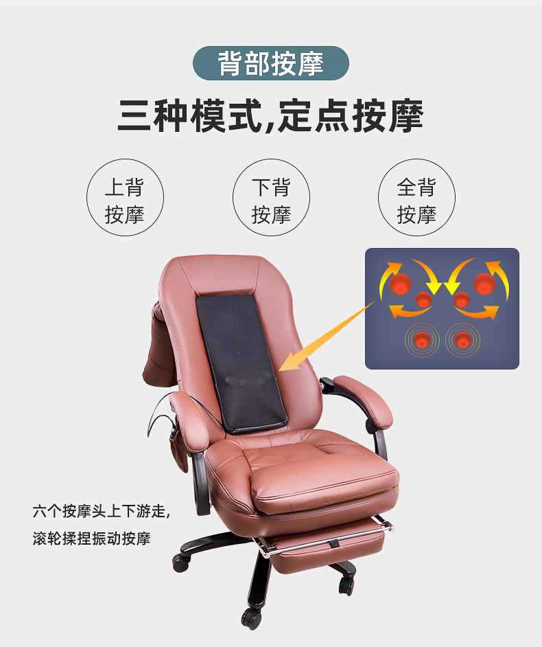 背部:上來(lái)來(lái)回按摩,有2組共4個(gè)按摩頭。